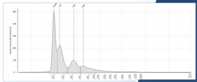 适用于短片段 cfDNA 提取,使用本产品提取 2mL 新生牛血清中的 cfDNA,提取后的 DNA 经 Agilent 4200 分析仪检测,流峰峰形饱满,片段长度符合 cfDNA 长度特征,其他位置杂峰少,纯度高。结果如下图:
