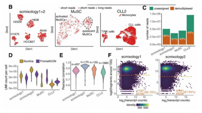 文章数据分析显示其中 40%-60% 的 Nanoporereads 可以分配给预期的 Barcode, 并保留用于后续分析(图 C)。在数据处理过程中,非全长且不能唯一分配给转录本的数据被丢弃。最终每个细胞的平均 UMI 为 10,000 至 60,000 个,并且与对应的短读数据情况相符(图 D)。Nanopore 和 Ilumina 数据的基因水平的 UMI 计数也高度一致(图 E)