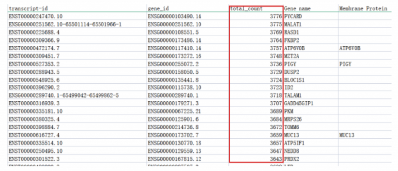 如同二代单细胞测序一样,三代全长测序同样会统计每条转录本在该样品中测到的总 count 数,截图如下: