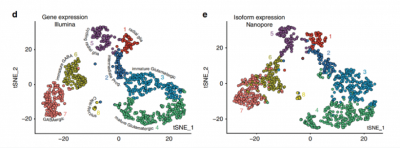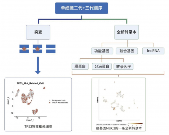 文章中,使用 10X Genomics 技术分选得到单细胞的全长 cDNA 后,将 cDNA 一分为二,一份进行打断建库用于二代测序,另一份进行全长扩增建库用于 Nanopore 三代测序。此时 Nanopore 的文库上也包含了细胞 Barcode, 后续可以通过分析流程将三代测序和二代测序结果通过细胞 Barcode 一 一 对 应。通过这样的方式,即实现了获得全长转录本,分析亚群的特征性转录本使用,并同时拿到了突变所在细胞。