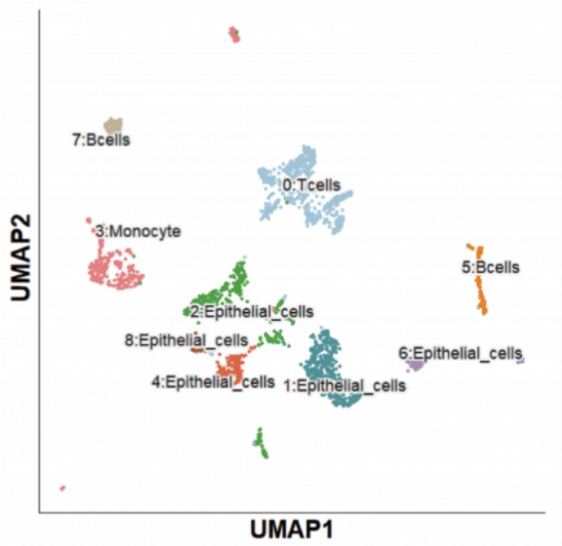 总计分 B cels、T cels、Monocyte cells、Epithelial cells 四大群。更精细的注释,如 Memory B、Treg、Naive T、ExhaustT、Mac 等我们会在后续章 节陆续展开讨论。