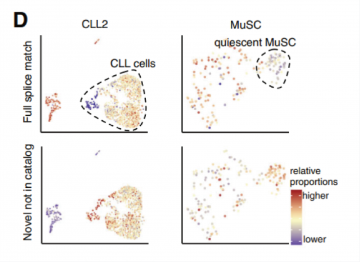 通过聚类分析发现,CLL(慢性淋巴细胞白血病)细胞相比正常免疫细胞具有更高比例的新型转录本,特别是新型剪接的转录本。同样,相比激活的干细胞,静态肌肉干细胞也有更高比例的新型转录本(图 D)。