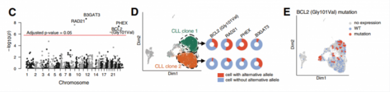 对 CLL 数据集进行分析,寻找只存在于癌细胞中的,且在不同的 CL 转录簇中具有不同等位基因频率的 SNVS,通过经典的曼哈顿图最终发现四个变异在不同的 CLL 聚类呈现显著差异(图 C, 图 D)。其中发现的 Gly101Val 突变,此突变已被证实通过降低 BCL2 对 venetoclax 的亲和力而使患者对 venetoclax 治疗产生耐药性,通过分析发现患者 CLL2 携带约 25% 的 GIV101Va| 突变,并发现该突变不仅属于亚克隆,而且与特定的转录簇相关(图 E)。
