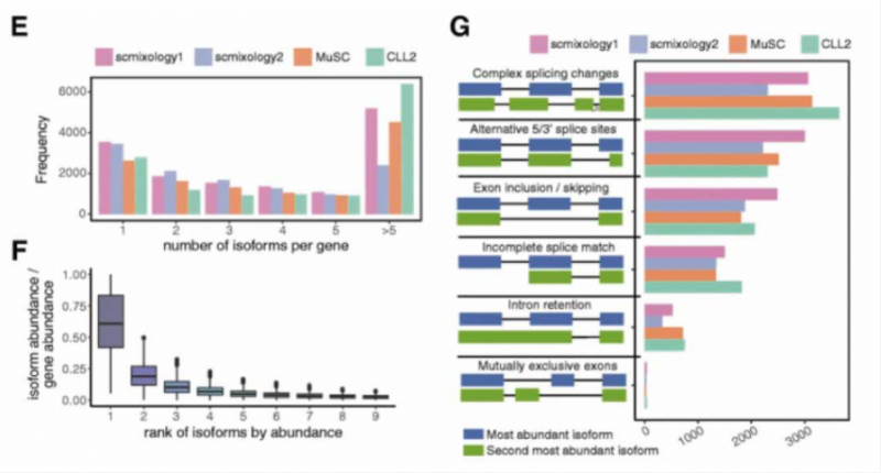 分析发现,约 80% 的基因可以表达多种转录本(图 E),但是大多数基因主要表达 1 到 2 种转录本类型(图 F),约 30% 的基因含有多于一种的可变剪接事件,意味着 2 个最高表达的异构体可能涉及多个外显子的复杂剪接变化而产生不同。