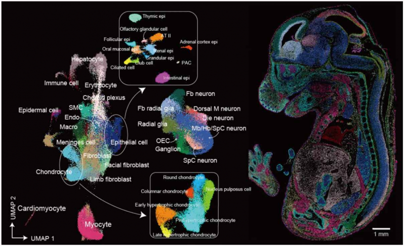 摘要: 结合 DNA 纳米球(DNB)模式阵列和原位 RNA 捕获技术,建立了 Stereo-seq(SpaTial Enhanced  REsolutionOmics-sequencing)技术,相较当前其他空间转录组技术,该技术拥有最大的捕获面积(最大 174.24 cm2)、最灵敏的基因捕获(1,450 个 UMI/100μm2)和单细胞分辨率;应用 Stereo-seq 对 C57BL/ 6 小 鼠胚胎发育第 9.5 天(E9.5)至第 16.5 天(E16.5)产出了共 53 张矢状切面的转录组图谱,其中包括来自同一个 E16.5 胚胎的 13 张连续切片,并进一步描述了小鼠胚胎发育中晚期的器官发育基因的空间表达模式以及器 官发育的轨迹,构建了小鼠器官发生时空转录组数据库(MOSTA);基于核酸染色影像进行细胞边界识别,获取了 E16.5 小鼠全胚胎具于空间位置的单细胞时空转录组信息,并在同一张切片上鉴定了 4 种上皮细胞 亚型和 6 种成骨细胞亚型的空间分布情况,描述了前脑的抑制性神经元从内侧神经节隆起至皮层的迁移轨 迹;在 E12.5、E14.5 以及 E16.5 小鼠的背侧中脑描述了中脑发育过程中的细胞分布异质性,并在中脑的脑室 区发现中脑区域放射状胶质细胞向神经细胞祖细胞或胶质细胞祖细胞两个分支的分化轨迹以及在中脑发 育过程中的时间分布异质性,找到了决定放射状胶质细胞分别向两个分支发育的关键微环境因子和调控 因子;利用 Stereo-seq 构建的小鼠中晚期的胚胎时空转录组图谱,描述了人类发育缺陷相关 1,959 个基因 在小鼠胚胎中表达模式,并在单细胞精度下研究了由 WNT5A 基因突变导致的罗宾诺综合征(Robinow  Syndrome)在小鼠上颚和肢体中累及的细胞类型,证明了应用 MOSTA 解析发育过程中疾病相关基因表达 的时空窗口和潜在累及细胞和器官方面的潜力。