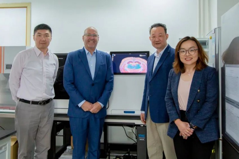 10 月 30 日下午,10x Genomics 首席商务官 James Wilbur 先生、全球渠道总监 Di Mo 女士、中国区总经理江滔先生、中国区销售经理许量先生、中国区高级市场经理赵琳琳女士一行来访伯豪生物,伯豪生物总经理肖华胜先生携副总经理兼 CTO 侯睿先生、总经理助理兼采购总监茅龙杰女士以及实验室总监赵莹女士一同接待了来访人员。
