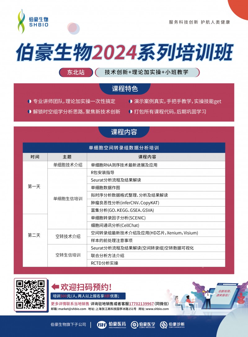伯豪生物 2024 系列培训班,从热门的 单细胞空间转录组数据分析培训 , 理论加实操 ,所有内容一网打尽,小班手把手教学, 名额有限,速来锁定你的培训名额!
